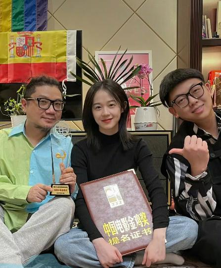 大陆女星阚昕拿着金鸡奖提名证书跟辛奇(右)、程青松(左)合照。(视频截图)