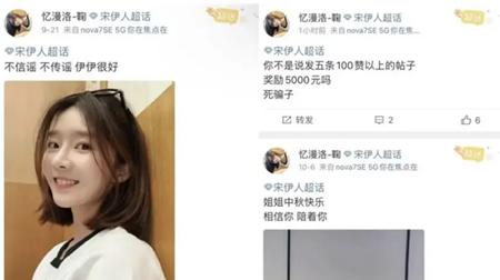近期,网路上流传一组截图,一名网友9月在“宋伊人超话”发文写下“不信谣,不传谣,伊伊很好”,并且贴上宋伊人的自拍照力挺。10月6日再发文说,“姐姐中秋快乐,相信你、陪着你。”