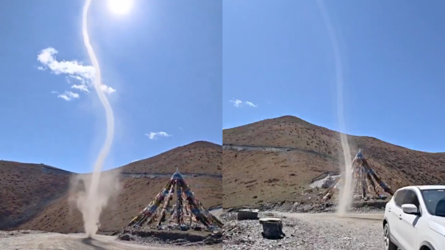 近日,有游客在四川自驾游,偶然遇到龙卷风“幼崽”,卷起沙尘舞动,轻巧玲珑宛若一条小龙。(视频截图合成)