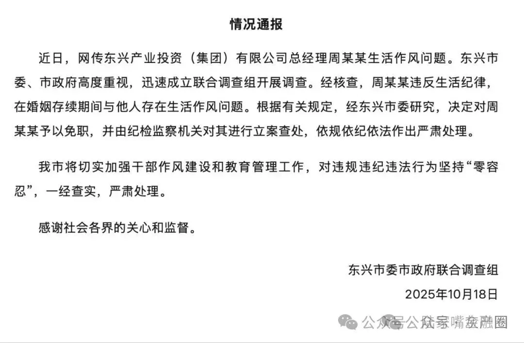 近日,网传东兴产业投资(集团)有限公司总经理周某某生活作风问题。