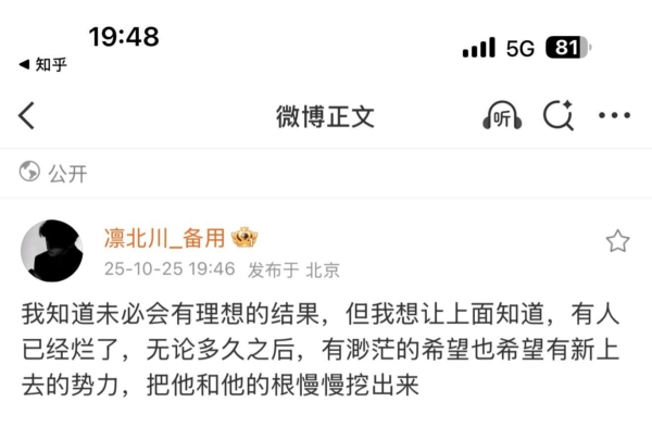 “凛北川”自称退伍军人,此前一直替于朦胧发声。在收到一条威胁信息后,他曾公开回呛,暗示自己是红色后代,还向对方叫阵“看看谁先死”。他还誓言“宁死不删帖”。