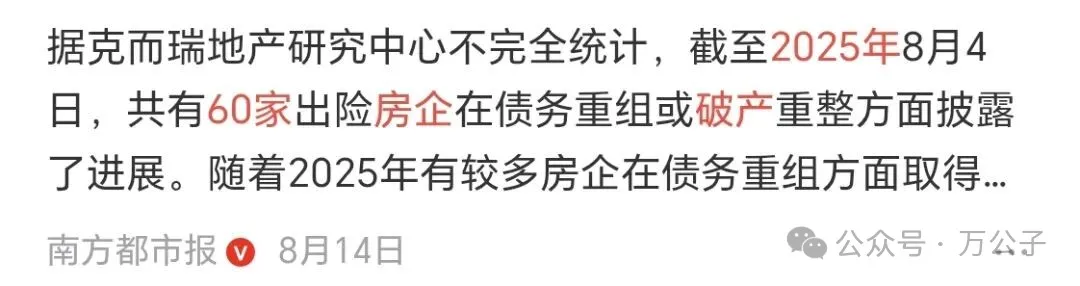 而且更为严峻的是,据克而瑞地产研究中心不完全统计,截至2025年8月4日,共有60家出险房企在债务重组或破产重整。