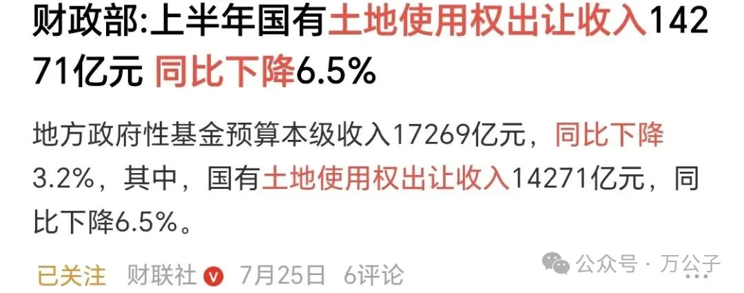 而且开发商没钱拿地,地方政府的土地出让收入也跟着锐减。财联社消息,上半年国有土地使用权出让收入14271亿元,同比下降6.5%,有的地区比高峰期下降超60%。