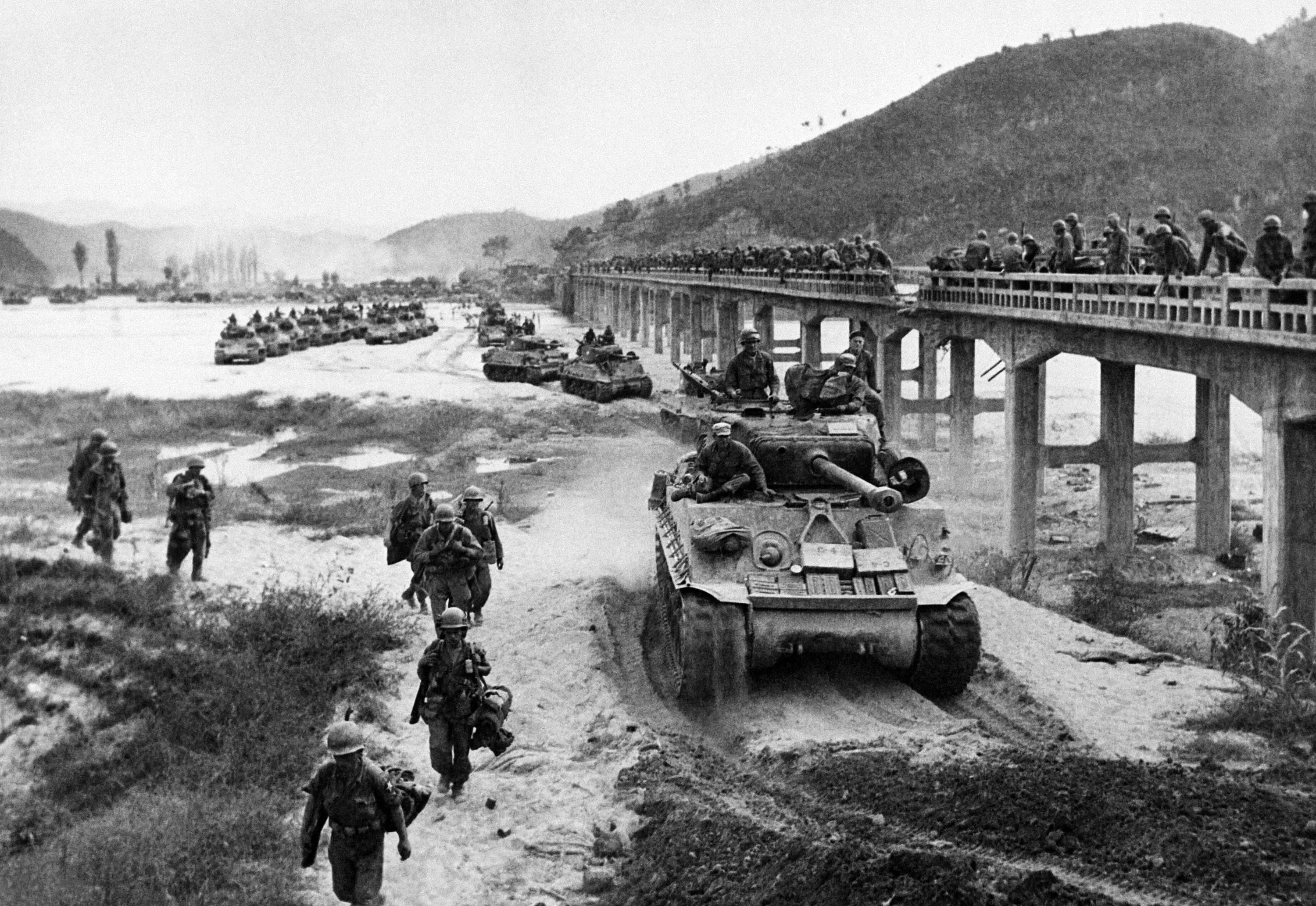 1950年10月17日,美军第1步兵师的坦克穿越韩国黄江,旁边是一座受损的桥梁。(AFP via Getty Images)
