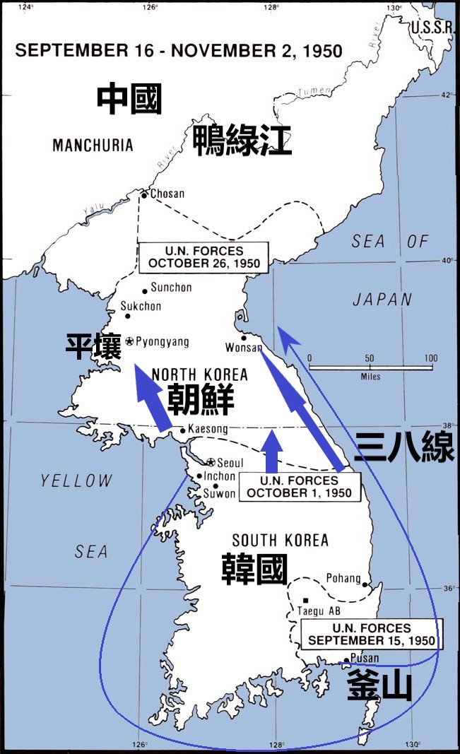 1950年10月初,联合国军队从陆路的东线、西线、中线全面越过三八线,也策划从元山登陆。10月26日,联合国部队推进至朝鲜北部。(美国空军历史研究局/大.纪.元;制图)
