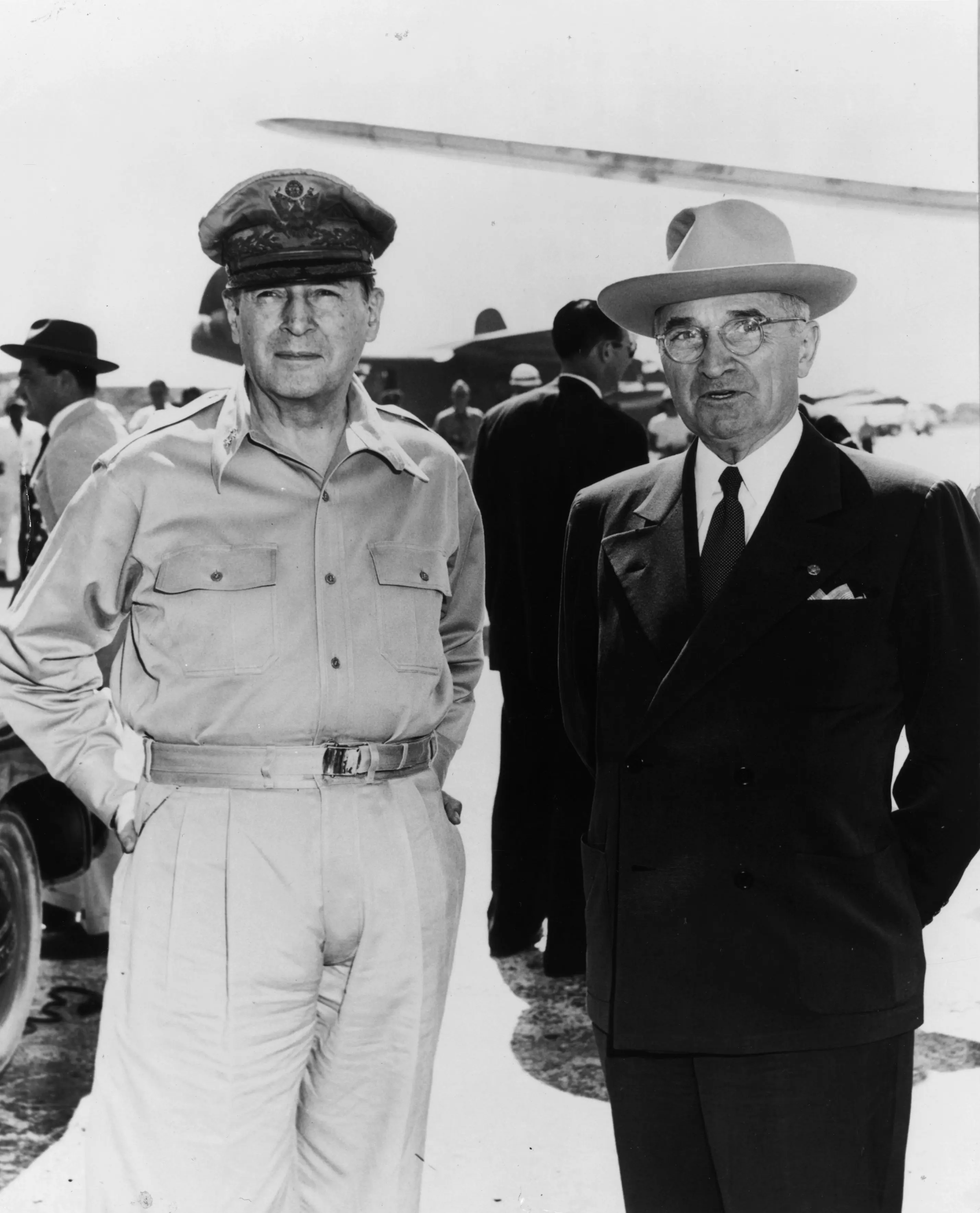 1950年10月15日,时任美国总统杜鲁门(Harry S. Truman,右)与麦克阿瑟将军(Douglas MacArthur,左)在威克岛见面。(MPI/Getty Images)