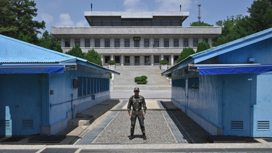 一名朝鲜外交翻译人员两个月前随团出访时,逃到韩国驻蒙古大使馆。图为一名韩国士兵在韩朝边境板门店的军事分界线(MDL)前站岗。(JUNG YEON-JE/AFP via Getty Images)