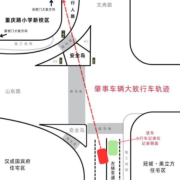 多位学生家长告诉水瓶纪元,事故发生时间正值一、二年级学生放学,家长和孩子聚在安全岛上,一同等红绿灯。事故地点紧邻重庆路小学新校区,一、二年级学生出入该校区校门,在老校区的三、四、五、六年级学生走旧门。学生家长刘静告诉水瓶纪元,新校区于今年8月底竣工。
