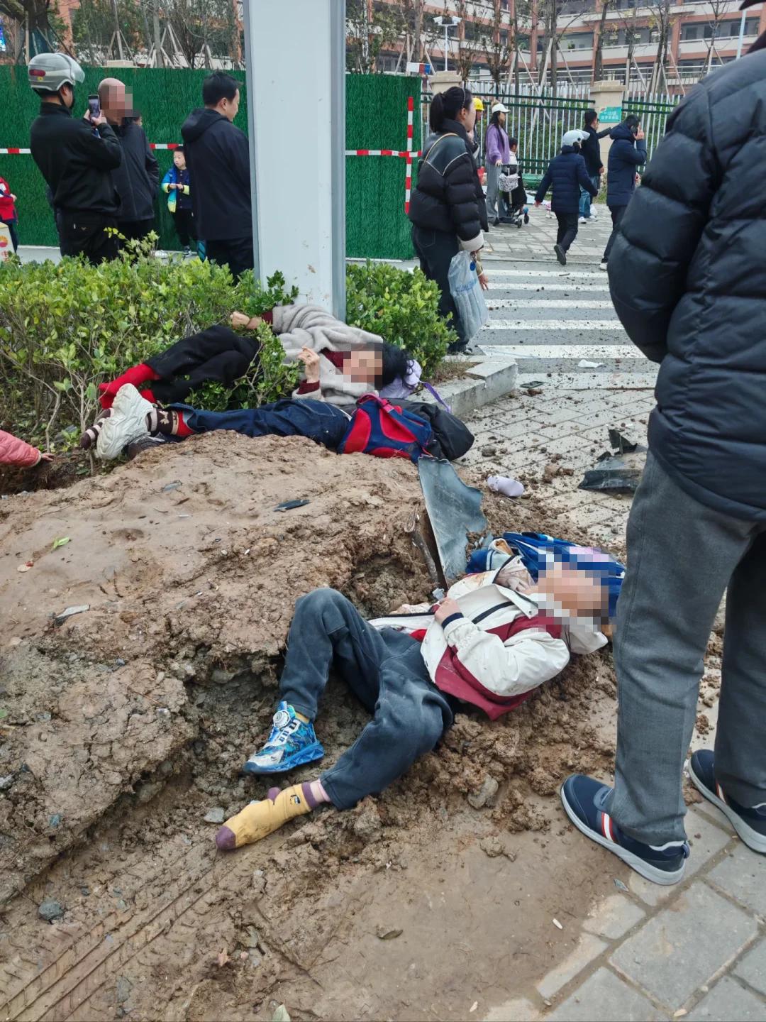 据现场视频,有着迷彩制服、穿黑色马甲的辅警扶着躺在绿化带中的孩子拨打电话。一男性正对一儿童进行心脏复苏,孩子脑后鲜血成流;一旁的城管托住其下巴,提醒周围人拨打120。一位母亲双手搭在浑身是泥的孩子身上,神情悲痛。有孩子身体陷在土堆里,有家长试图叫住一位穿白大褂的医生。视频中有打电话,抢救,喧哗的议论声,孩子的哭喊声,以及躺在地上、鞋子丢失的成年人与未成年人。