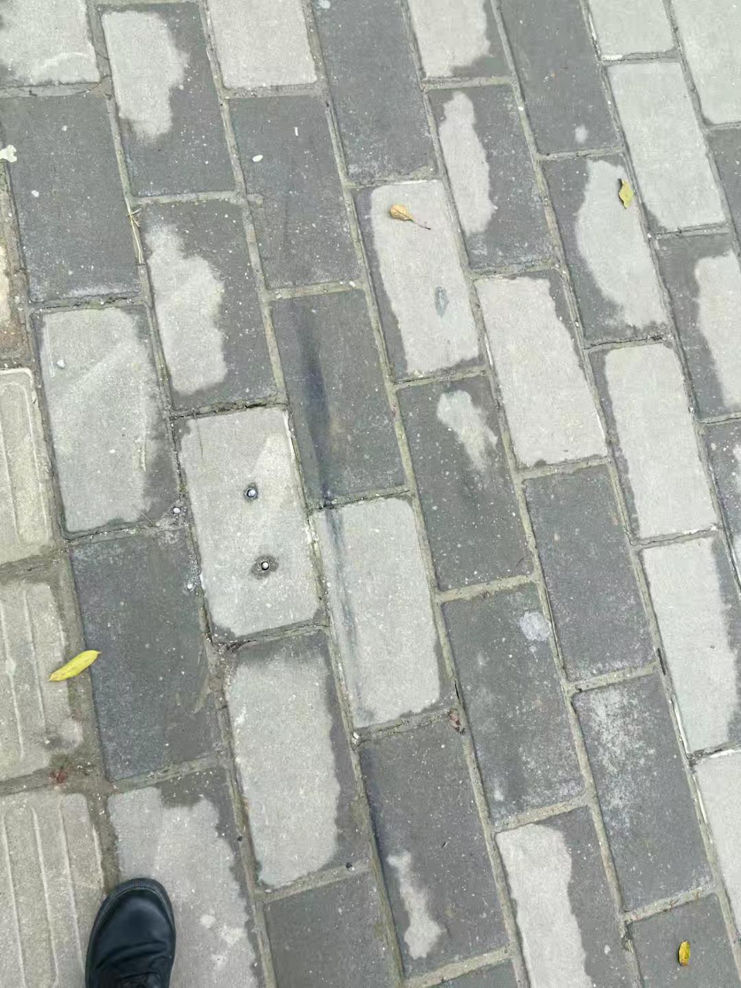 刘静注意到,安全岛上没有护栏,人行道上正对着安全岛的四个路障石全被撞倒,人行道更远处的四个路障石中有两个断裂。刘静事后在人行道上看见一道明显的黑色划痕,她认为是肇事车辆撞击受阻后车胎和地面摩擦留下的,有可能是车辆最终停下的位置。一位身高约1.6米的家长迈步丈量,从安全岛上的土堆处步行至该划痕,走了90步。