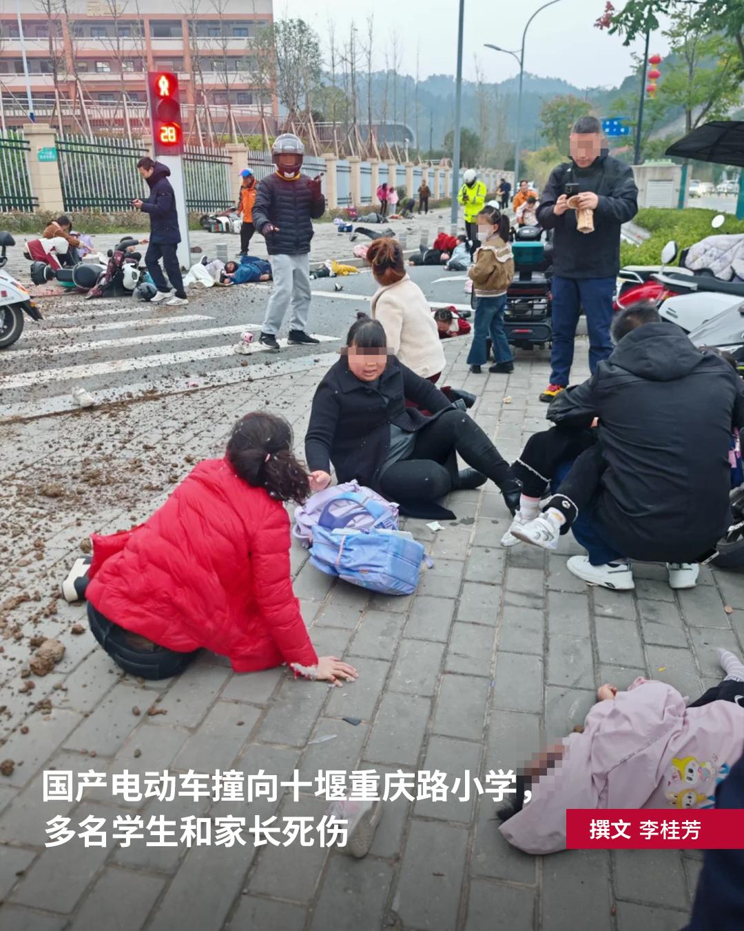 近两个月来,十堰阴雨连绵。事故当日天空阴暗,最低温度5.6℃,也是当月最低气温,很多行人都戴着帽子。网传视频显示,面对突如其来的事故,家长们茫然地拿起孩子肩上的书包,或安抚受惊的孩子。许多人沉默地坐着或躺着,一位女士上衣里的填充物飘落全身。有人现场进行抢救,亦有倒地者无人顾及。圆柱形路障石翻倒在地,不止一辆电动车被甩在一旁,碎片四散。