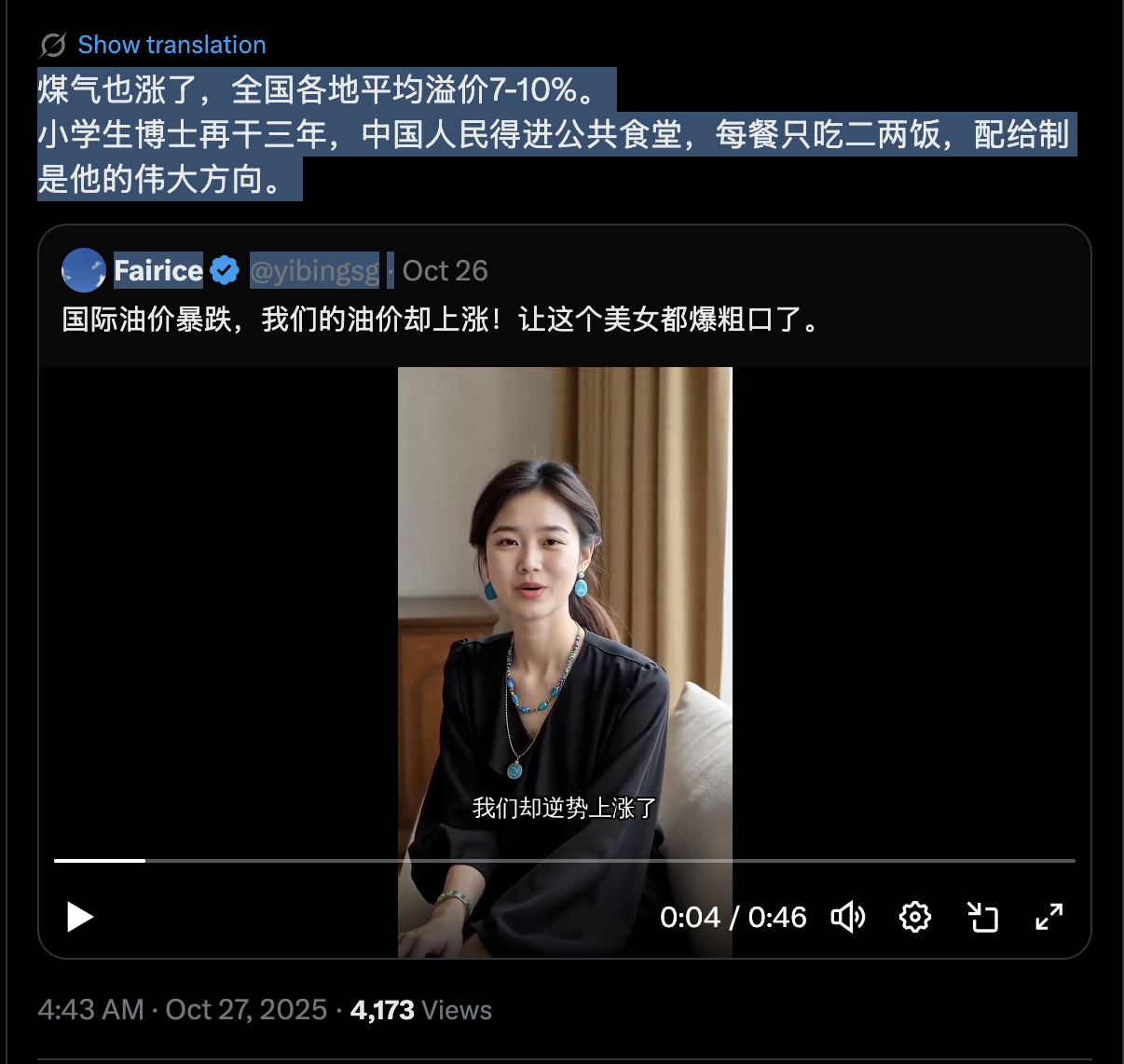 网友Sunny Chen发帖说,中国的煤气也涨了,全国各地平均溢价7-10%。小学生博士再干三年,中国人民得进公共食堂,每餐只吃二两饭,配给制是他的伟大方向。