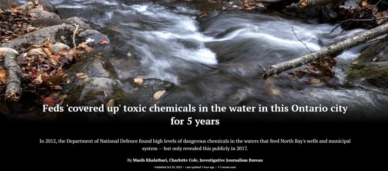 加拿大国防部(DND)早在 2012 年就发现了安省北湾(North Bay)饮用水源中存在高浓度的PFAS(“永久性化学物质”),这种有毒物质主要源于机场和军事基地长期使用的消防泡沫。