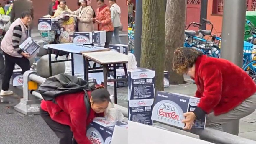 2025年10月26日,四川成都举办了一次马拉松赛,赛后整箱的矿泉水遭围观民众集体哄抢,视频曝光引发热议。(视频截图合成)