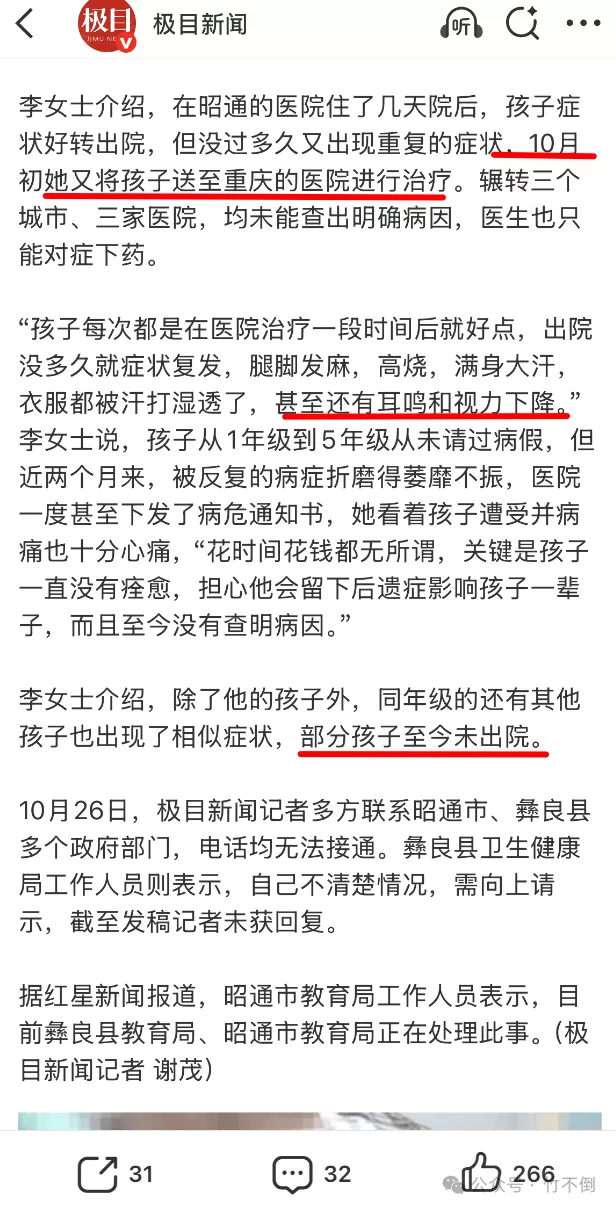 云南昭通一小学多人患病,持续近两个月,原因不明。甚至已有医院给家长发过病危通知书了……好好的孩子,家长含辛茹苦养育到十几岁,然后就是这种飞来横祸,连半点反应的时间都没给他们留。