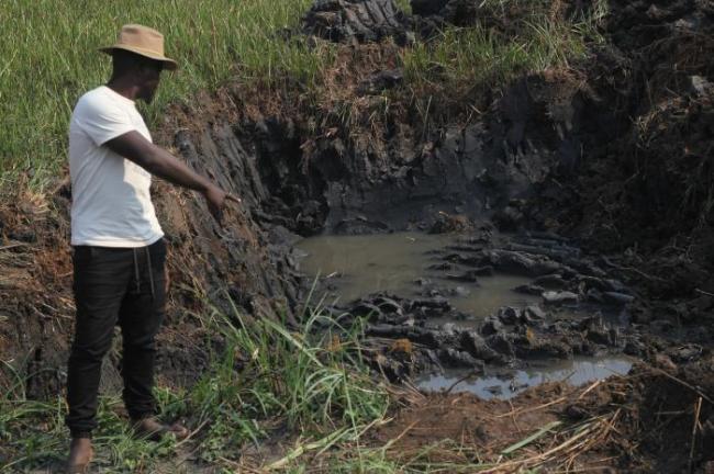 蒂米·卡宾德拉的家里有四个鱼塘受到泄漏污染。他指着一个正在建设中的新池塘。
