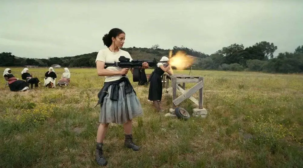 派菲迪亚用机关枪顶着孕肚射击,与女儿长大后的射击画面形成对照