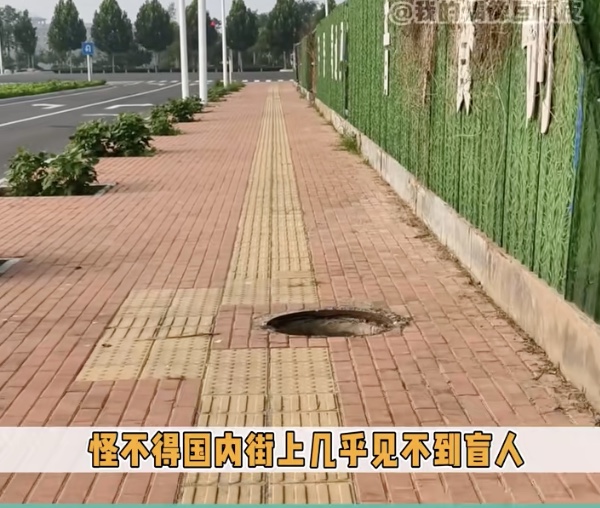 在大陆社交媒体随意搜素,便会看到大量的评论盲道被占用、不合理、被阻挡的视频。如有的盲道被建筑物截断,有的盲道通到河里、盲道上有电线杆或下水道口,盲道上停满了车辆等等,网友说,“盲道上除了盲人,什么都有。”