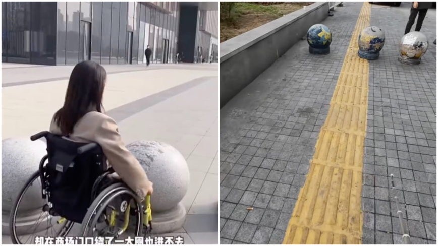 视频显示,该女子从地铁出来,发现只有手扶梯直通商场,她只能先从地铁到地面,打算从外面大门进入商场。然而,等她到了地面才发现,商场门口竟全是密密麻麻的石墩,轮椅根本过不去。她只能继续往前走,绕了半天的路也进不去,全部都有石墩子挡路。