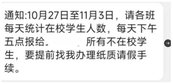 据海外社交平台X账号“海外爆料”披露,安徽某大学下发紧急通知,要求自10月27日至11月3日期间,每个班级班长每日上报在校学生人数,每天下午5点前汇报,不在校学生必须提前递交纸质请假条。文件特别强调要“防止聚集活动”,并将校外动向列入重点监控范围。