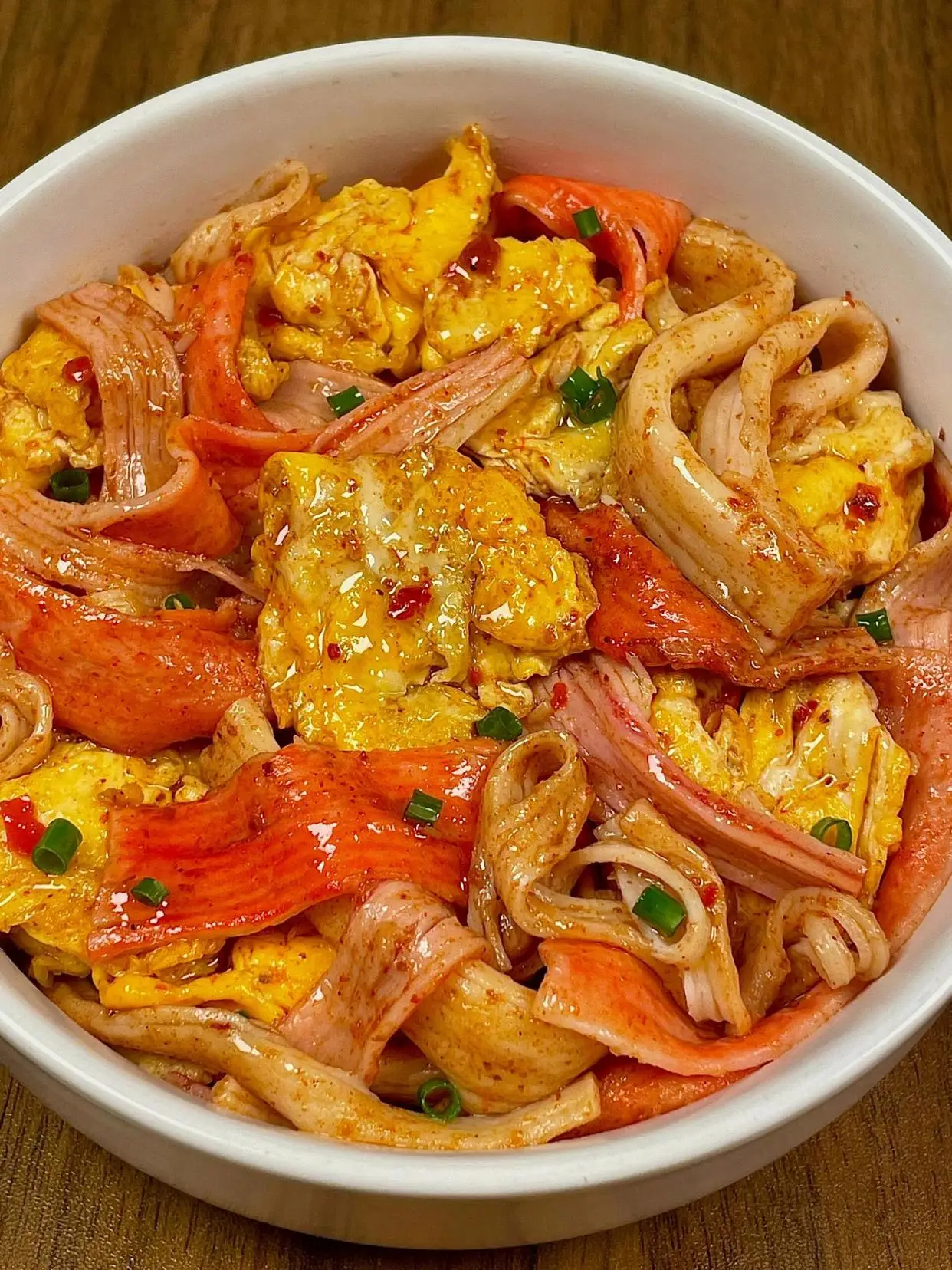 鸡蛋嫩滑得像豆腐,蟹柳鲜香有嚼劲,酱汁浓郁微辣,咸甜适中,每一口都让人停不下来,简直是下饭神器!