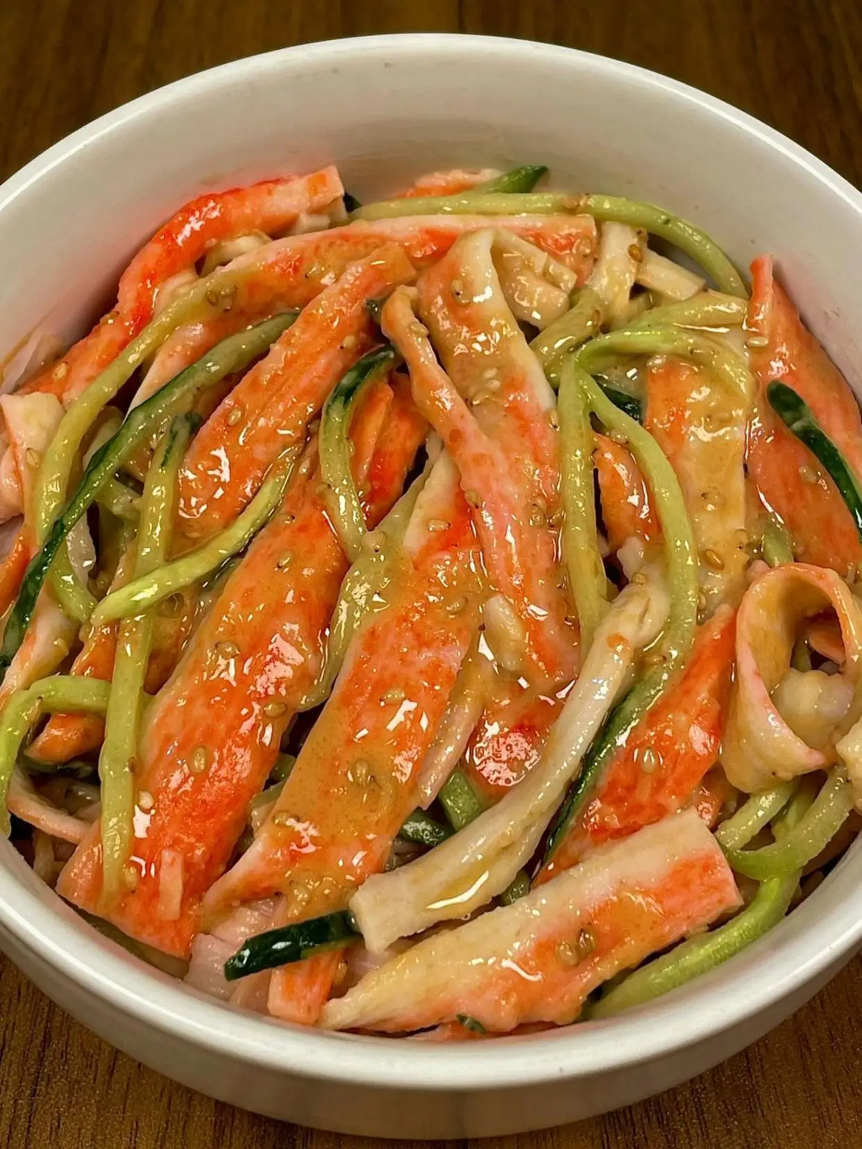 蟹柳鲜嫩,黄瓜爽脆,芝麻酱的香气浓郁,酸甜适中,清爽不油腻,每一口都带着芝麻的香气,特别适合夏天!