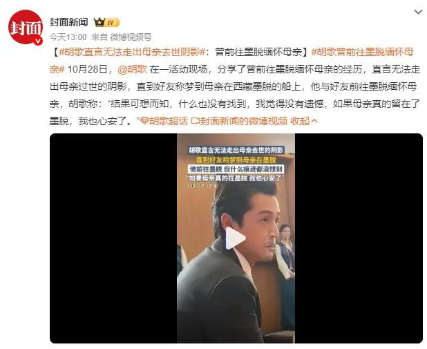 10月28日,胡歌在一活动现场,分享了曾前往墨脱缅怀母亲的经历,直言无法走出母亲过世的阴影,直到好友称梦到母亲在西藏墨脱的船上,他与好友前往墨脱缅怀母亲,胡歌称:“结果可想而知,什么也没有找到,我觉得没有遗憾,如果母亲真的留在了墨脱,我也心安了。”