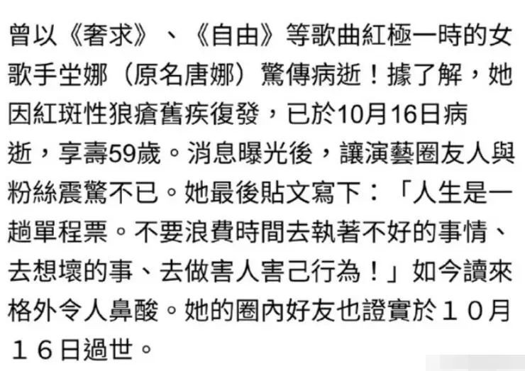 据台媒报道,台湾女歌手坣娜疑似因红斑狼疮于16日病逝,享年59岁,该消息已被好友证实。