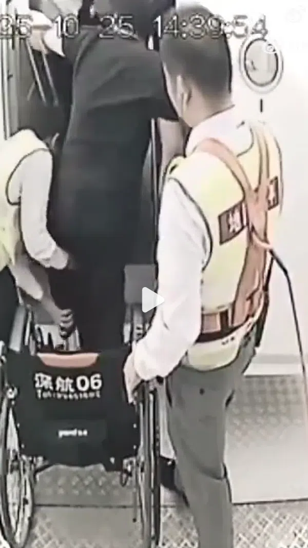 不过,眼尖的网民从监控视频显示的时间发现,视频是以两倍速度播放。如果按原速播放,郑智化实际在登机口滞留了三分钟,地勤和空姐花了更多时间商量对策。有网民认为,这说明航司并没有针对残障人士的预案,“全靠现场想办法”。