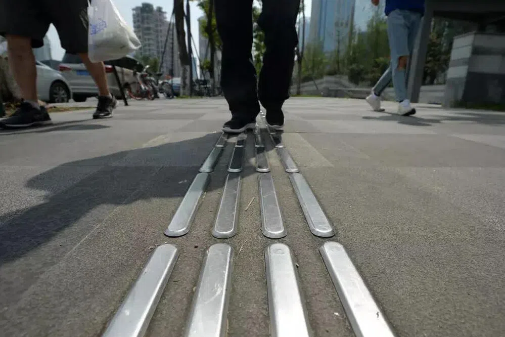 视障脱口秀演员黑灯曾吐槽,一些城市的不锈钢盲道雨后十分湿滑,走上去“跟溜冰没有任何区别”。(互联网)