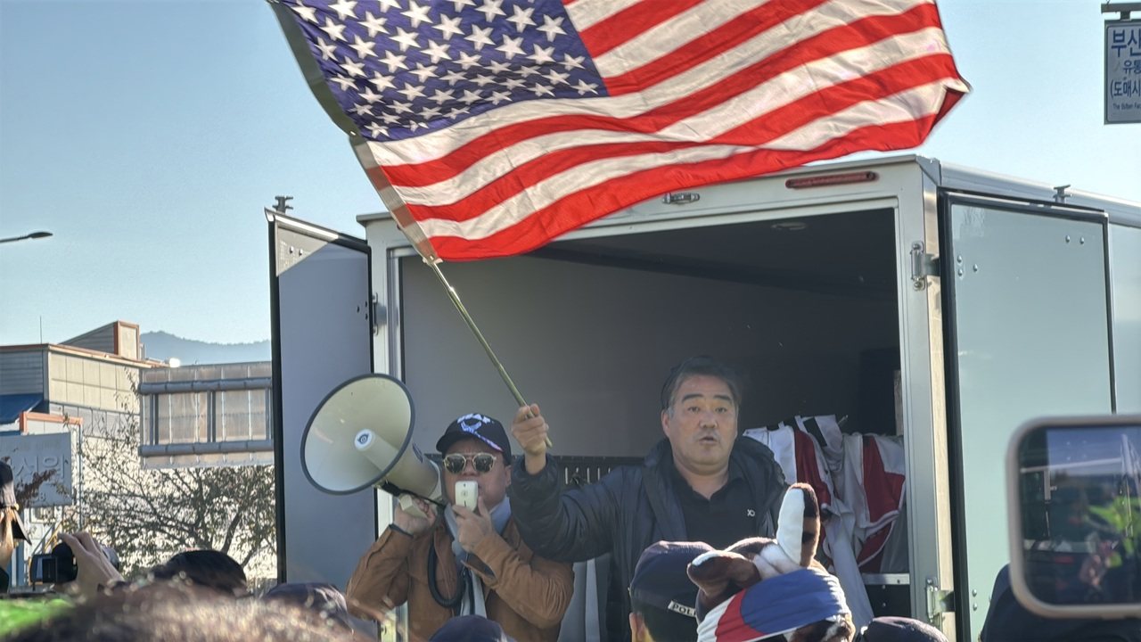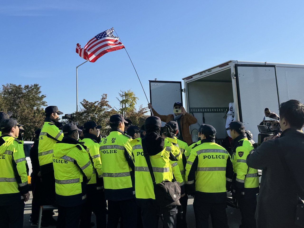 记者在金海国际机场附近守候,有大批警力在机场旁的军事基地外围戒备,隔街有一名民众驾驶货车,头戴美国空军图样的鸭舌帽,站在车斗上挥舞美国国旗,用大声公大喊“USA”、“独裁者习*近*平滚出去、滚回你的国家”等,警方广播称该民众没有申请集会,要求其自行离开,双方在现场僵持半小时后,该民众驾车驶离。