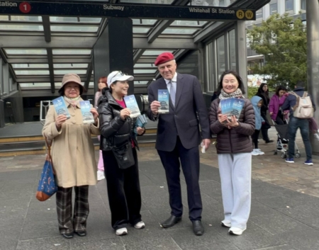 纽约市长选举提前投票进入第五天,共和党市长候选人斯利瓦(Curtis Sliwa)10月29日早上在曼哈顿南端的史坦顿岛渡轮码头召开新闻发布会,他在地铁站外碰到了全球退!党!中心的义工在派发“打倒中共恶魔”(End CCP)传单和征签,斯利瓦也大方地拿着“End CCP”传单与义工合影,并说“No CCP!”