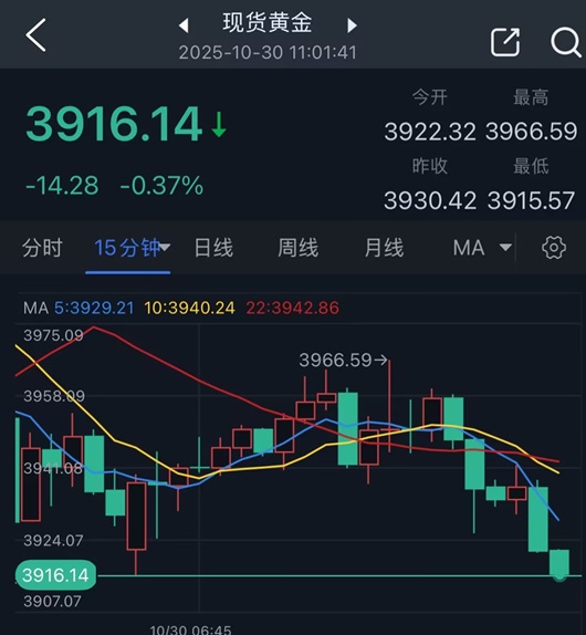 现货黄金价格自日内高点3966.59美元/盎司大幅回落,目前位于3916美元/盎司附近。
