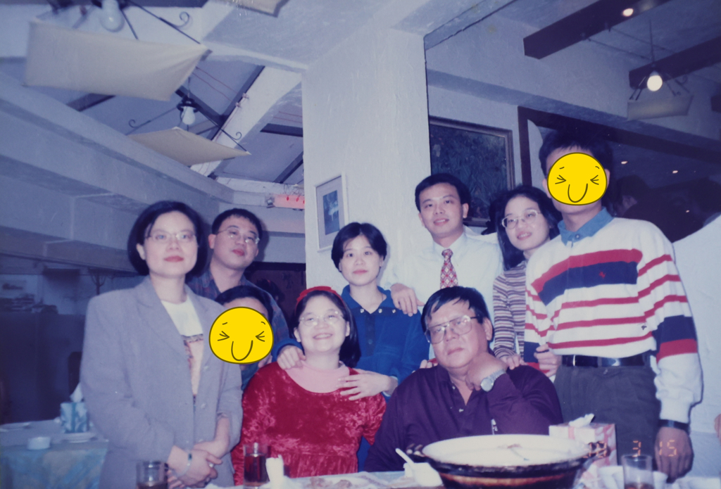 林作逸(后排右3)和其他兄弟姊妹胀大后各有成就、各奔东西,全家人也难得和父亲(前排右1)同框合照。(何祥瑀翻摄)