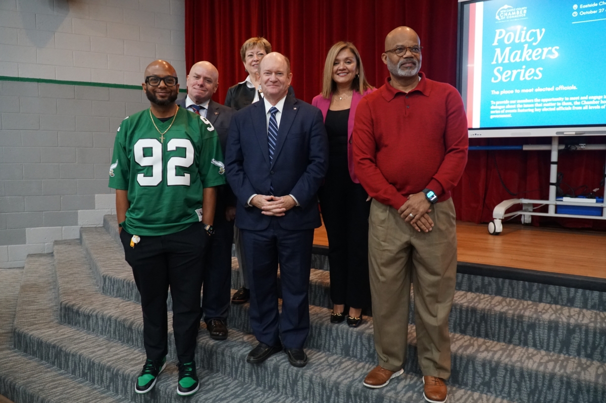 2025年10月27日上午,特拉华纽卡斯(New Castle)县商会在东区(Eastside)特许学校举办与政策制定者沟通的聚会,特拉华州联邦参议员克里斯·库恩斯(Chris Coons)演讲。(肖捷/大.纪.元;)