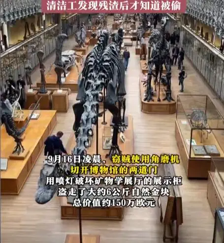 9月16号那天,博物馆的清洁工打扫卫生时,发现地上有奇怪的残渣,一抬头才看见放金块的展柜空了,足足6公斤的自然金块,说没就没了。