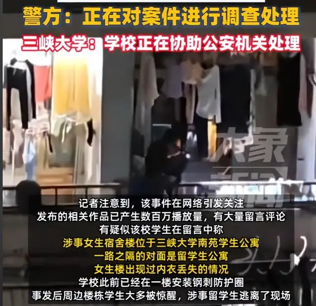 之前丢内衣的事儿如果真的存在,那说明宿舍安全可能早就有漏洞了,随着三峡大学女寝闯入事件在网络上不断发酵,10月29日前后,事件的相关进展才慢慢清晰起来。