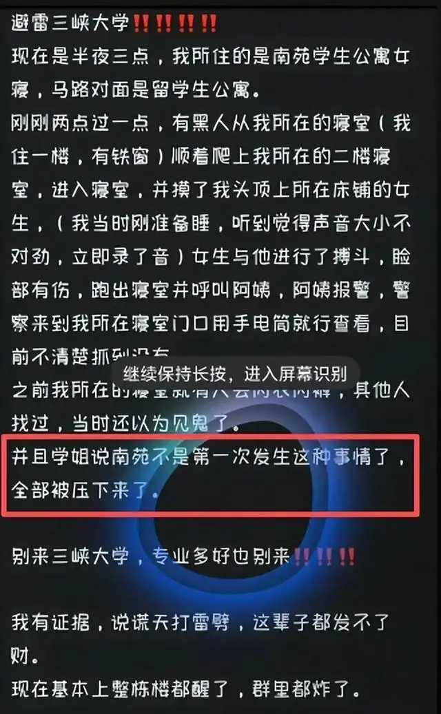 更让人关注的是,不少知情人还在陆续曝出猛料,有个自称住在南苑学生公寓女寝的人,深夜发帖避雷学校,还特别强调之前就发生过类似的事,只是都被压下去了。