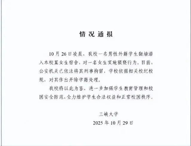 界面快讯2025-10-29——三峡大学通报男性外籍学生翻墙进入女生宿舍实施猥亵:开除学籍