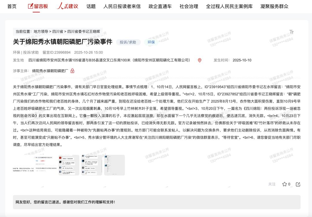 2、10月15日,ID“23927852”给四川省委书记王晓晖留言:“朝*磷肥厂污染我们的农作物和我们老百姓的身体,几个月了越来越严重,到现在还没给老百姓一个处理方案,他们又在开始生产了2025年8月13号,农作物大面积受伤害,直到10月9号早上老百姓呼吸磷肥化工厂的气体,又一次出现烟雾刺鼻,10月10号早上竹林树木叶子全落,希望领导重视。”