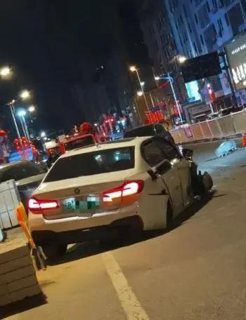 网友在互联网上曝光的事故现场照片显示,一辆白色宝马车身歪斜地停在街边,右边车轮处有明显损毁。