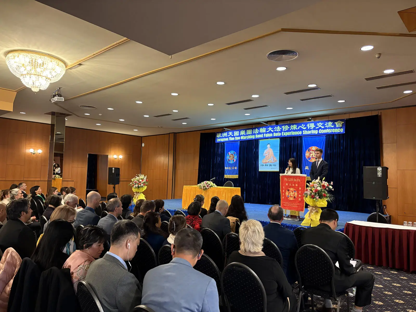 2025年10月12日,欧洲天国乐团的法轮功学员在捷克首都布拉格顶级酒店(Top Hotel Praha)举办了法会。(明慧网)