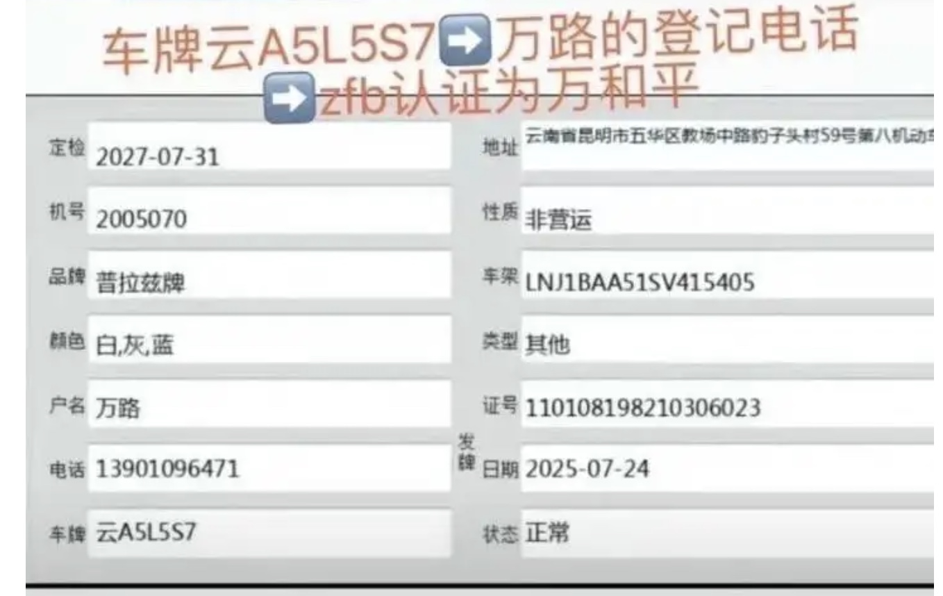 知情网友爆料,“野小孩”“父母”所开的房车注册信息曝光,房车车牌号为“云A5L5S7”,户名为“万路”,购车日期为2025年7月24日,为该车付款者支付宝账号名称为“万和平”。另外,据企查查信息显示,万和平在2023年10月24日,注册了一个公司,类型为“畜牧业”。