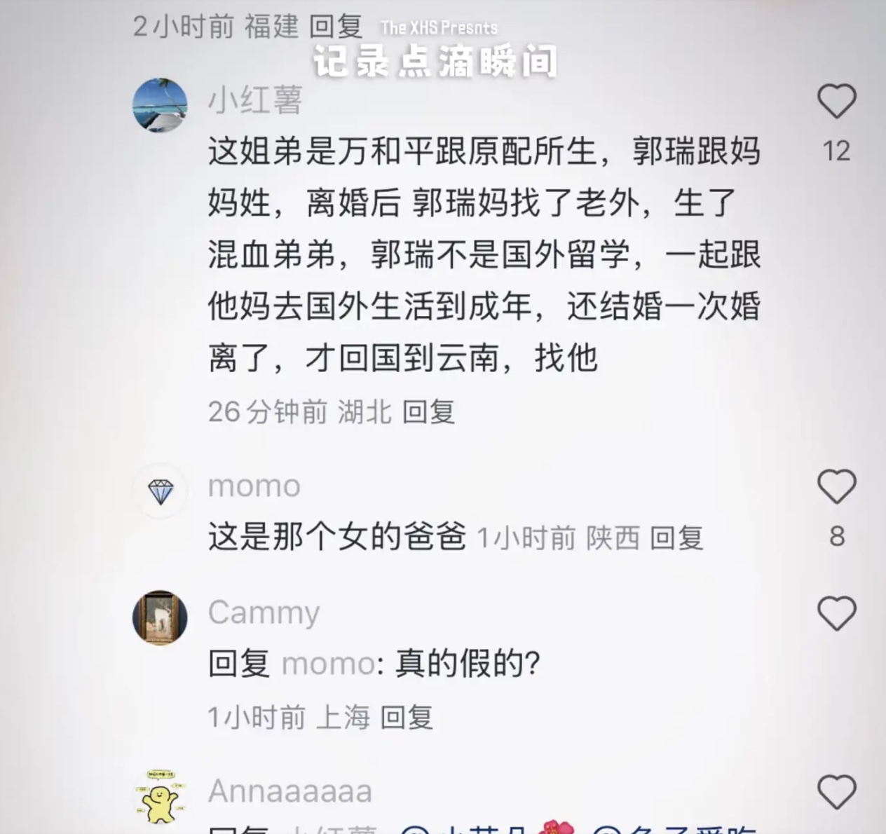 据知情网友提供信息称,小孩“母亲”名字叫万路,“锅巴”真名为郭瑞,两者是姐弟关系,都是万和平的孩子,郭瑞跟着母亲姓,后来郭瑞妈妈与万和平离婚,嫁给了外国人,郭瑞被妈妈带着去国外生活至成年。
