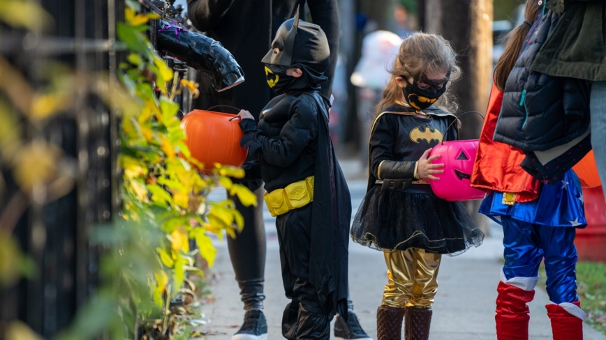万圣节期间,孩子们忙着挨家挨户要糖,家长们也别忘了,“安全”才是最重要的。图为2020年10月31日,纽约市伍德劳恩高地,孩子们在万圣节“不给糖就捣蛋”活动中透过糖果滑槽获得糖果。(David Dee Delgado/Getty Images)