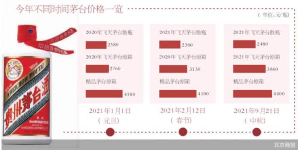 对比2021年的价格,飞天茅台价格已经腰斩。当年9月21日,飞天原箱曾出现过3860元/瓶;据四川在线2021年8月5日报导,一位酒商销售人员告诉记者,“散装的茅台2850元一瓶,不含税钱。”