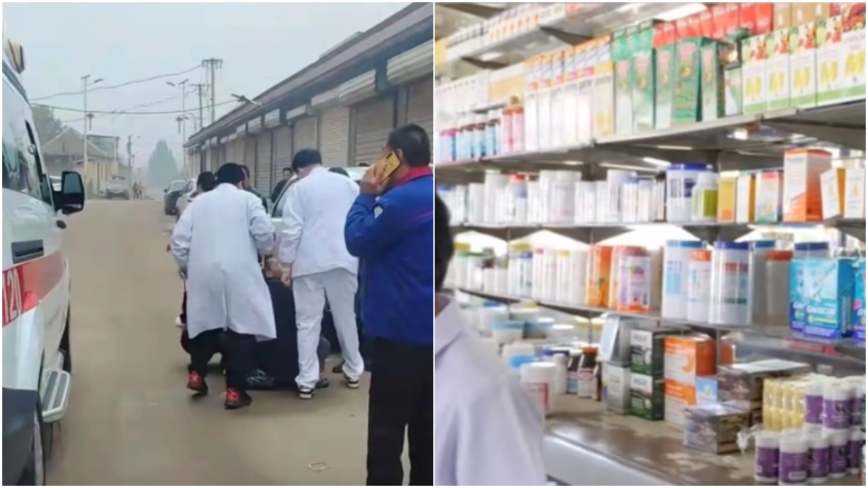 2025年10月29日,山东4岁男童药店打针呕吐抽搐,2小时后死亡。图左为孩子母亲难过昏倒,图右为一家药店。(网络截图)