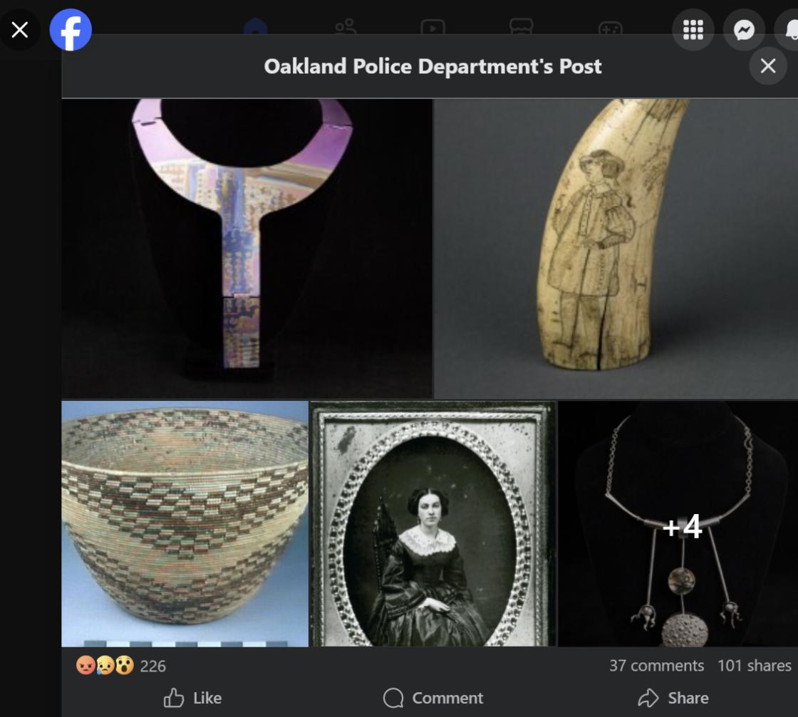 2025年10月15日凌晨3时30分前,加州奥克兰博物馆(Oakland Museum of California)遭窃,超过1,000件历史文物被盗。图为部分被窃文物。(奥克兰警察局脸书平台)