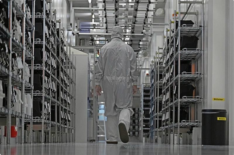 安世半导体的一名员工走过该公司的无尘室。图:翻摄自腾讯网