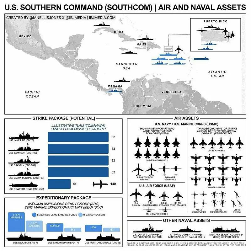 美军大规模集结于委内瑞拉周边各地,数量远超过单纯反毒需求,双方局势持续紧张。图:翻摄自 X